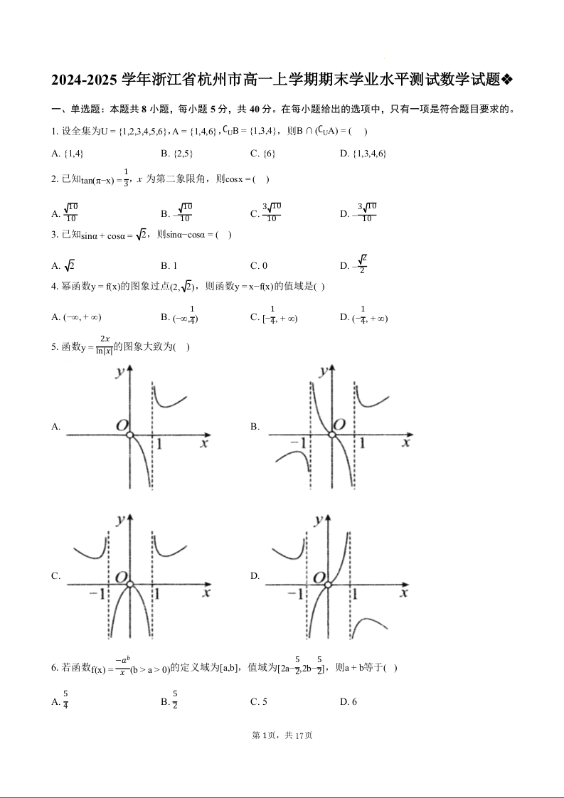 浙江省杭州市2024-2025学年高一上学期期末学业水平测试数学