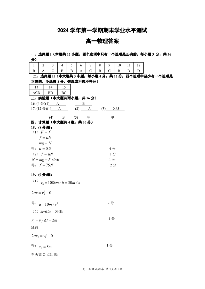 浙江省杭州市2024-2025学年上学期1月高一期末考试物理答案