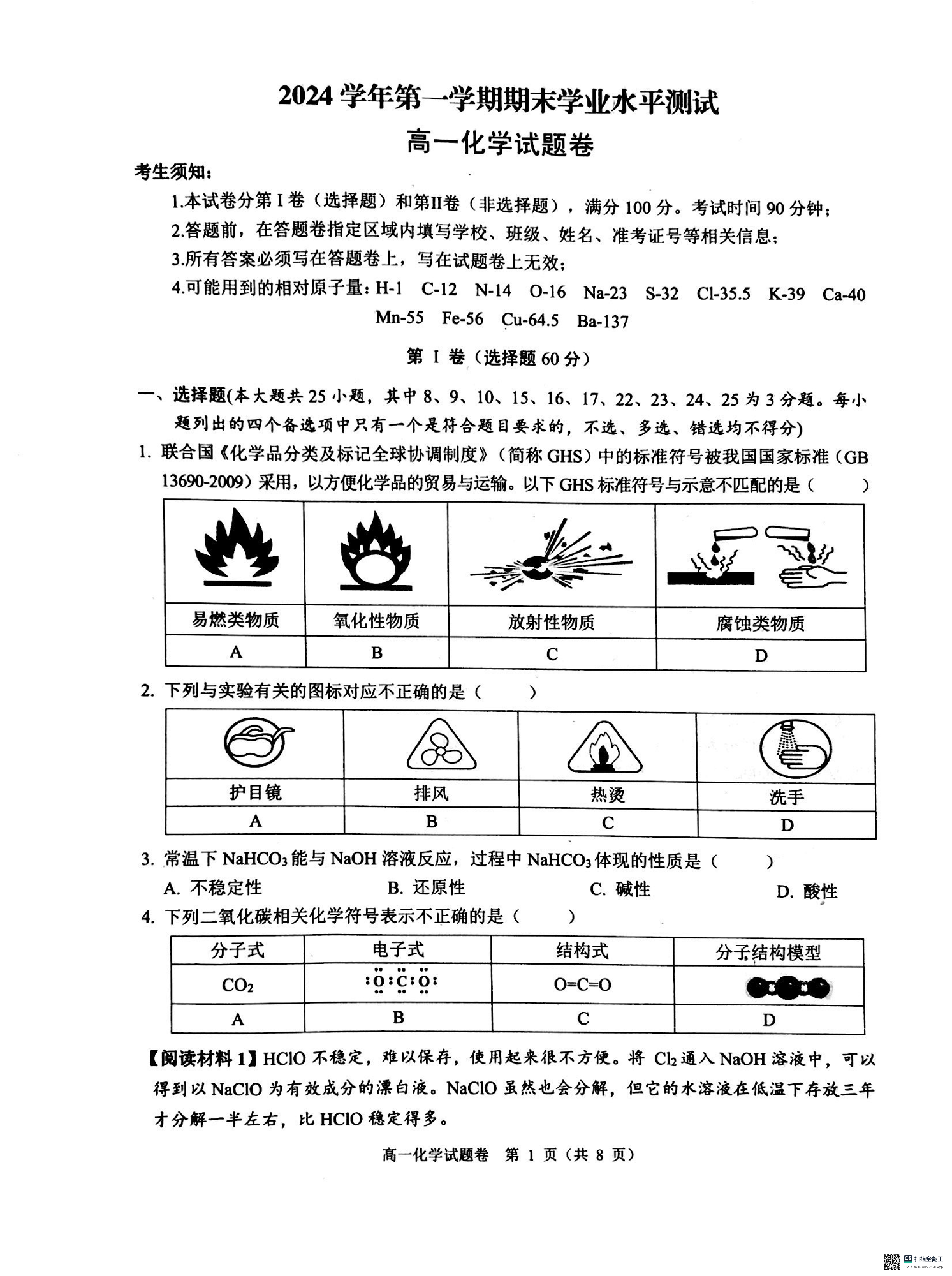 浙江省杭州市2024-2025学年上学期1月高一期末考试化学