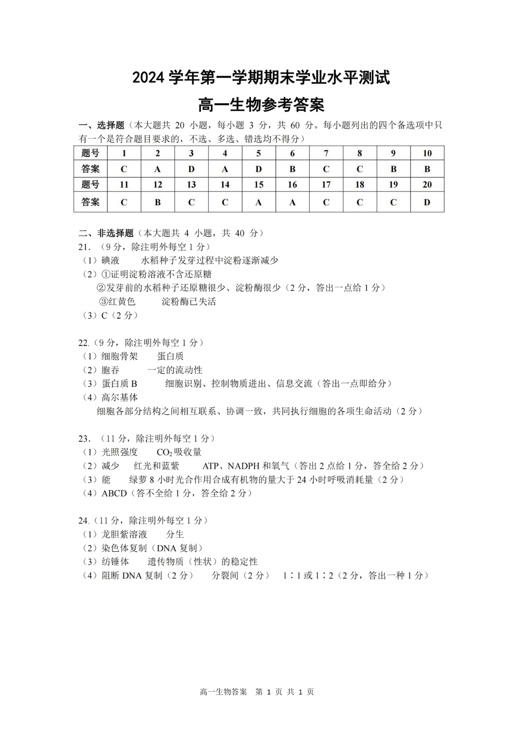 浙江省杭州市2024-2025学年上学期1月高一期末考试生物答案