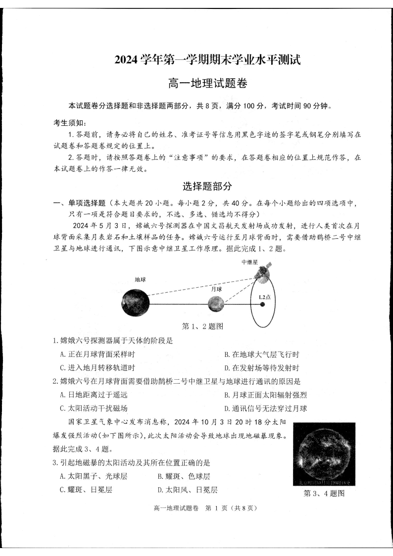 浙江省杭州市2024-2025学年上学期1月高一期末考试地理