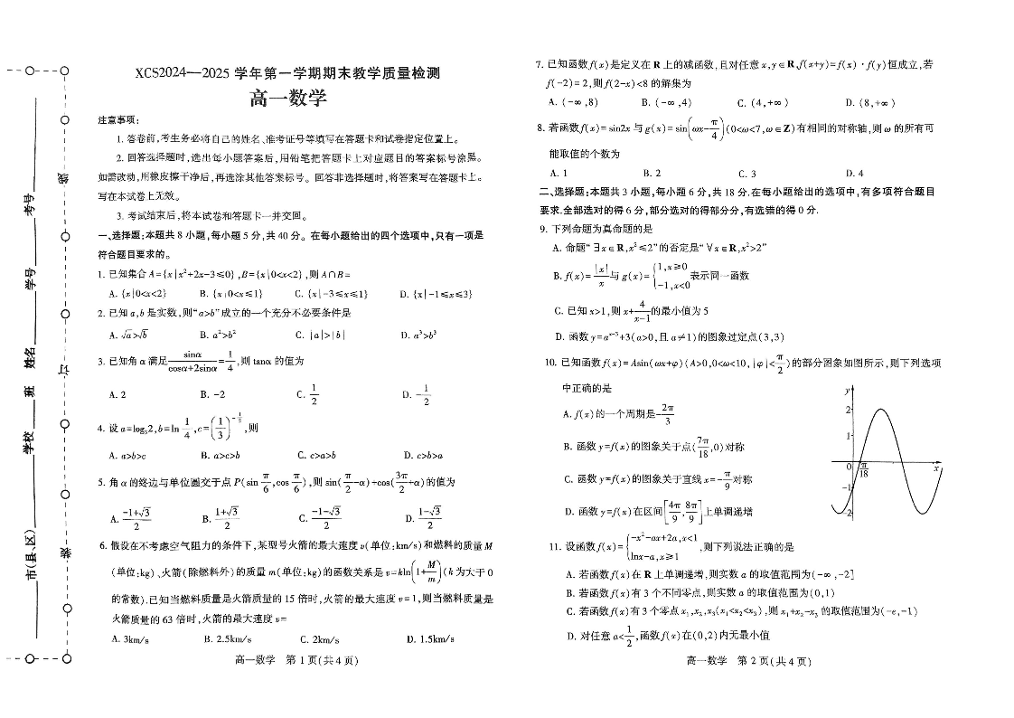 河南省许昌市2024-2025学年上学期1月高一期末考试试题数学