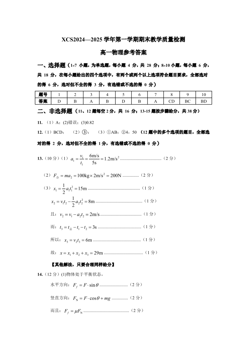 河南省许昌市2024-2025学年上学期1月高一期末考试试题物理答案