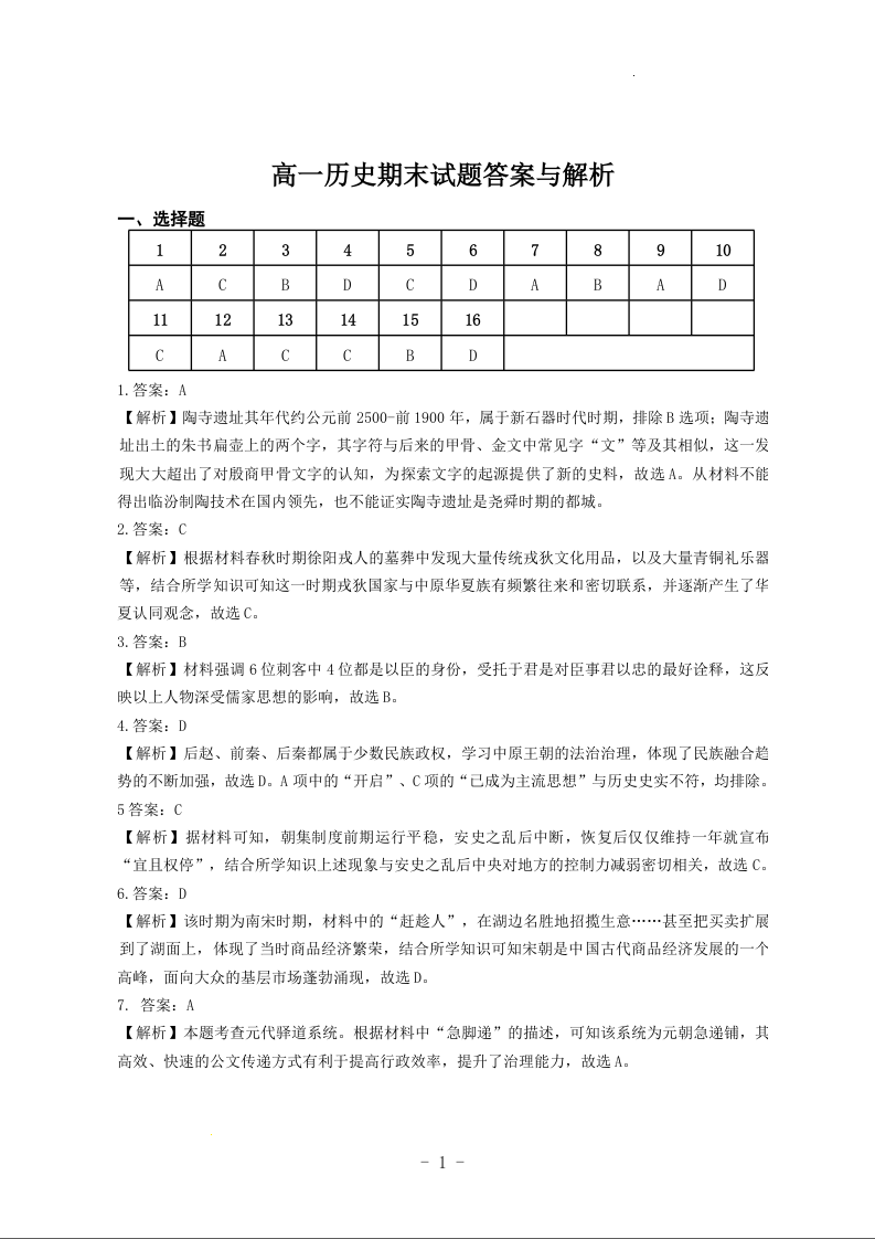 河南省许昌市2024-2025学年上学期1月高一期末考试试题历史答案