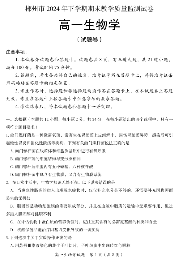 湖南省邵阳市2024-2025学年上学期1月高一期末考试生物