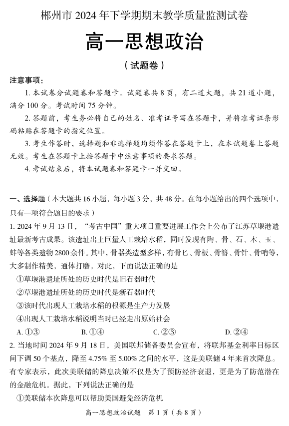湖南省邵阳市2024-2025学年上学期1月高一期末考试政治
