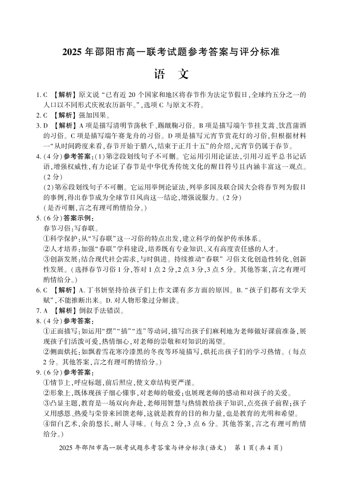 湖南省邵阳市2024-2025学年上学期1月高一期末考试语文答案