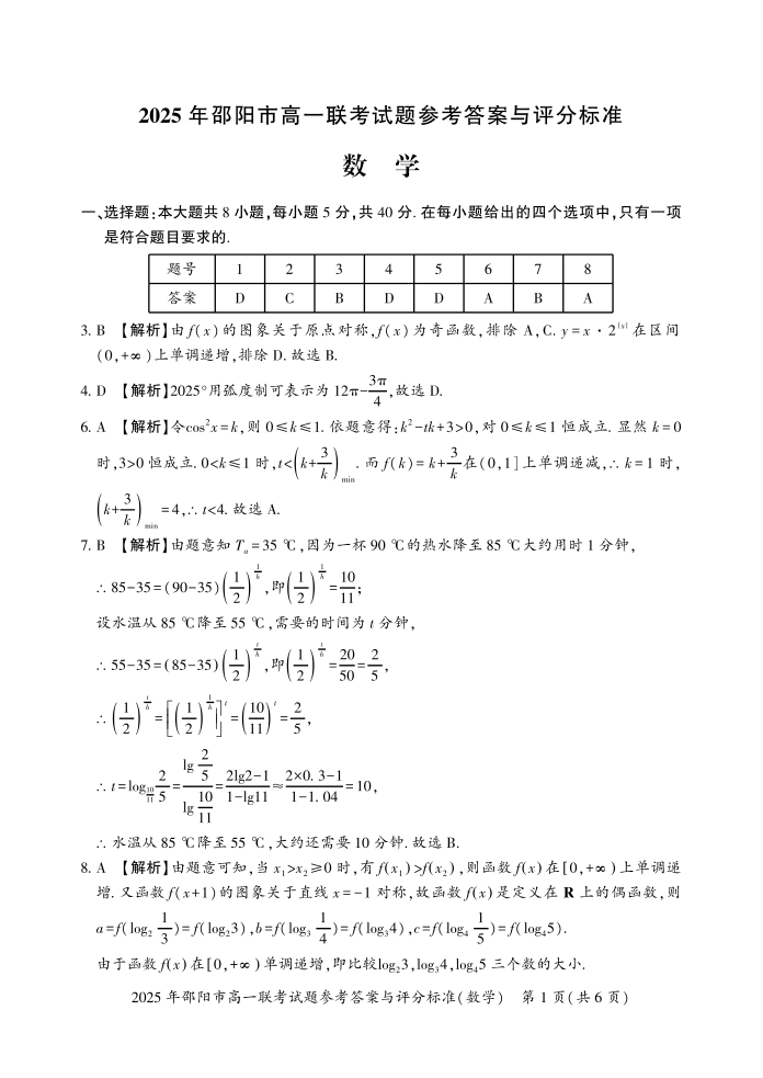 湖南省邵阳市2024-2025学年上学期1月高一期末考试数学答案