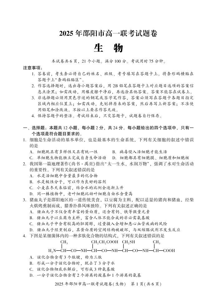 湖南省邵阳市2024-2025学年上学期1月高一期末考试生物