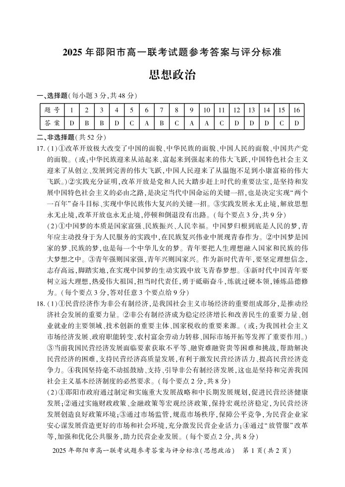 湖南省邵阳市2024-2025学年上学期1月高一期末考试政治答案