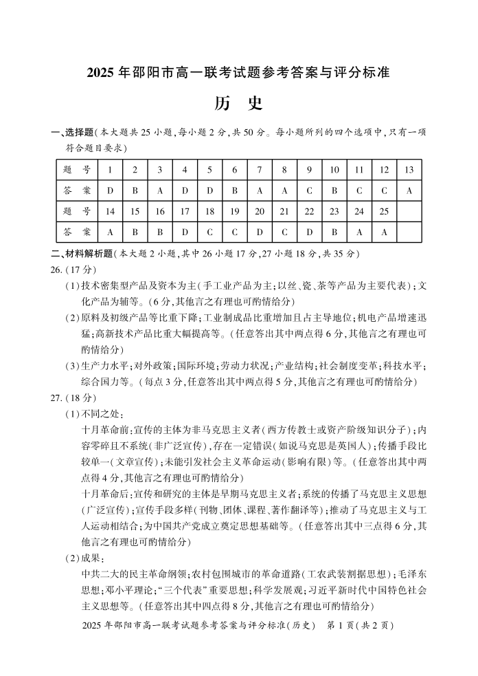 湖南省邵阳市2024-2025学年上学期1月高一期末考试历史答案