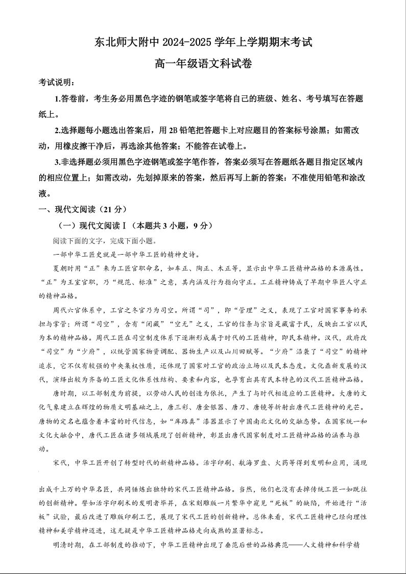 吉林省东北师大中2024-2025学年上学期高一期末考试语文(解析版)