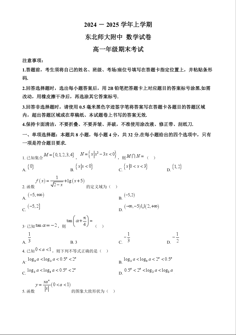 吉林省东北师大中2024-2025学年上学期高一期末考试数学(原卷版)