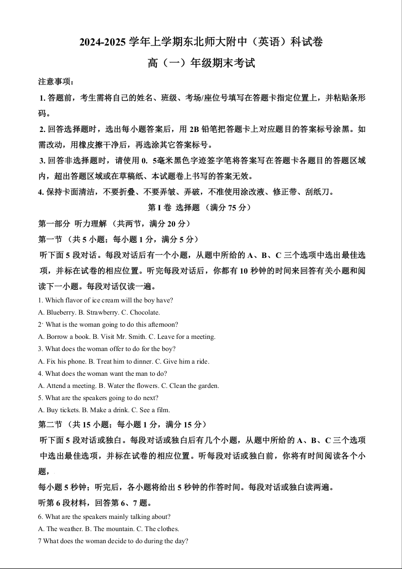 吉林省东北师大中2024-2025学年上学期高一期末考试英语(解析版)