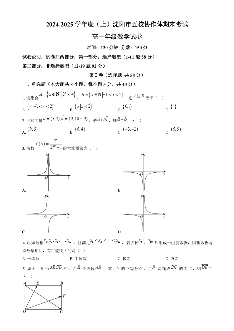 辽宁省沈阳市五校协作体2024-2025学年上学高一期期末考试数学(原卷版)