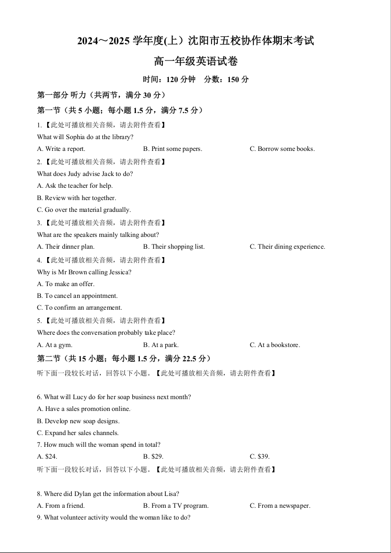 辽宁省沈阳市五校协作体2024-2025学年上学高一期期末考试英语(原卷版)