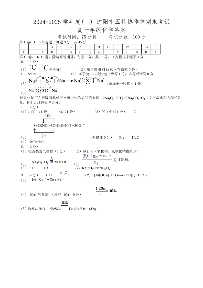 辽宁省沈阳市五校协作体2024-2025学年上学高一期期末考试化学答案