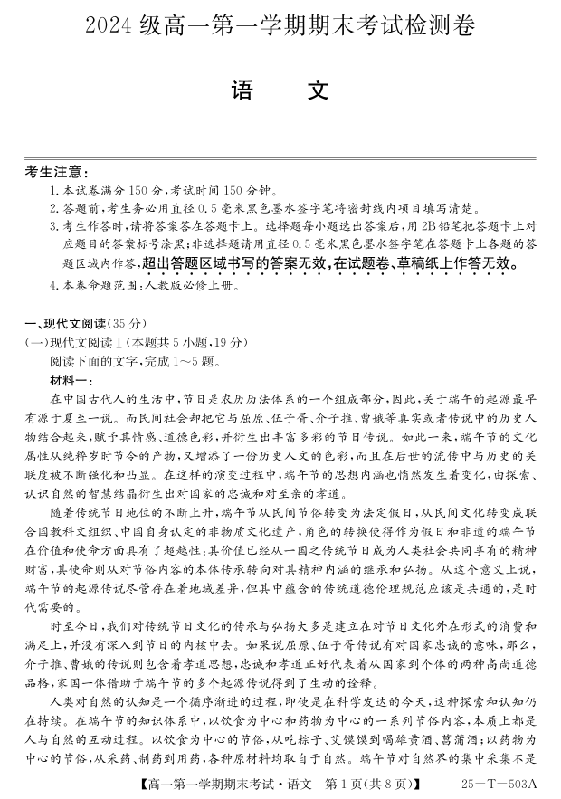 陕西省九师联盟2024-2025学年上学期1月高一期末考试语文