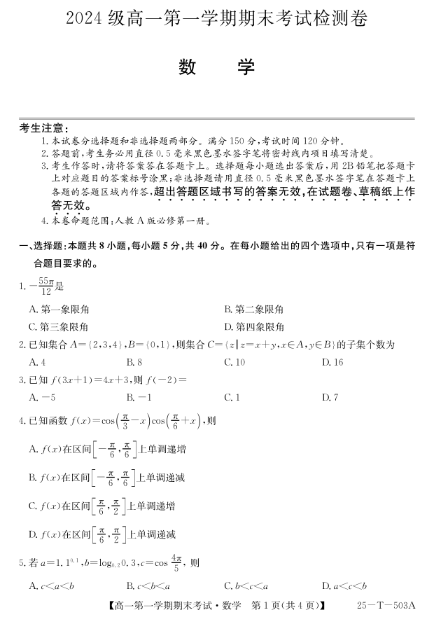 陕西省九师联盟2024-2025学年上学期1月高一期末考试数学