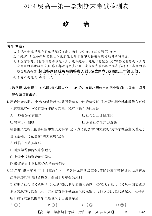 陕西省九师联盟2024-2025学年上学期1月高一期末考试政治