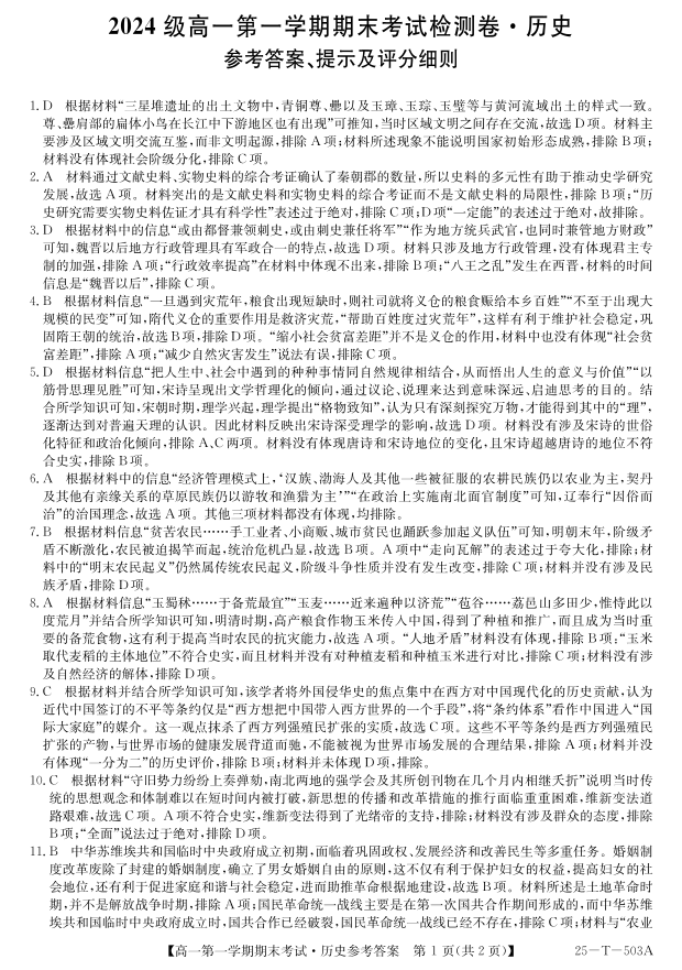 陕西省九师联盟2024-2025学年上学期1月高一期末考试历史答案