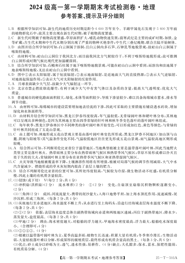 陕西省九师联盟2024-2025学年上学期1月高一期末考试地理答案
