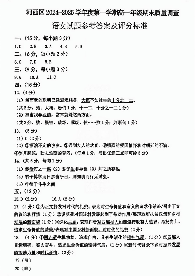 天津市河西区2024-2025学年上学期1月高一期末考试语文答案