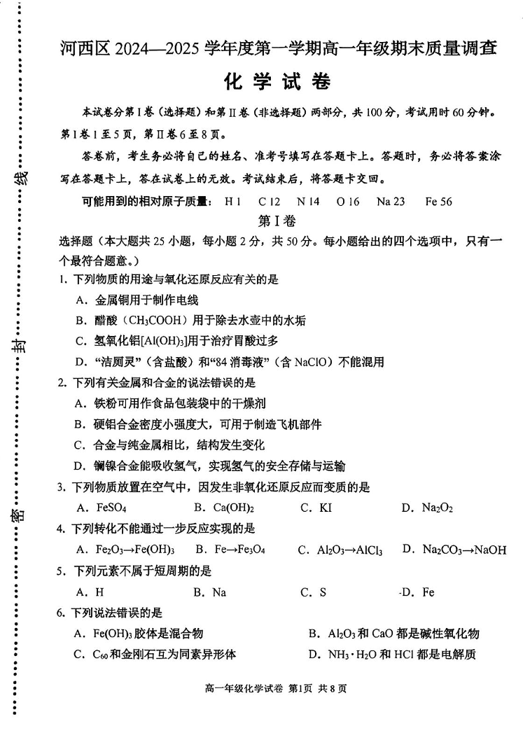 天津市河西区2024-2025学年上学期1月高一期末考试化学
