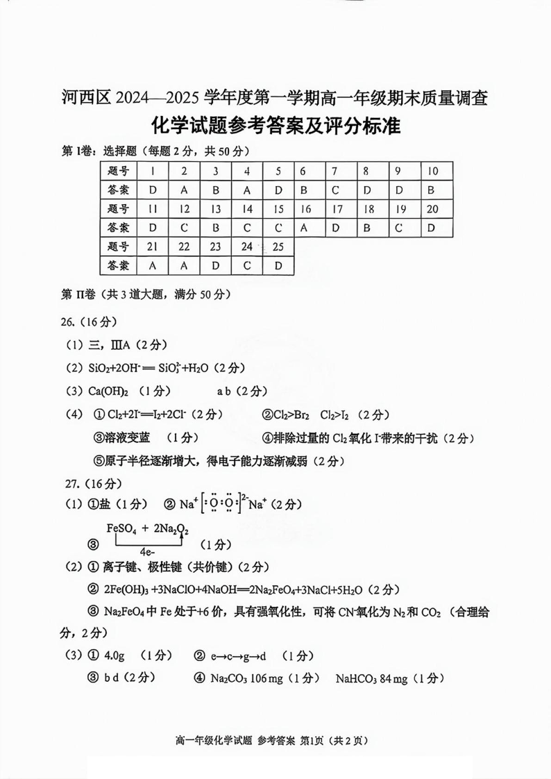 天津市河西区2024-2025学年上学期1月高一期末考试化学答案