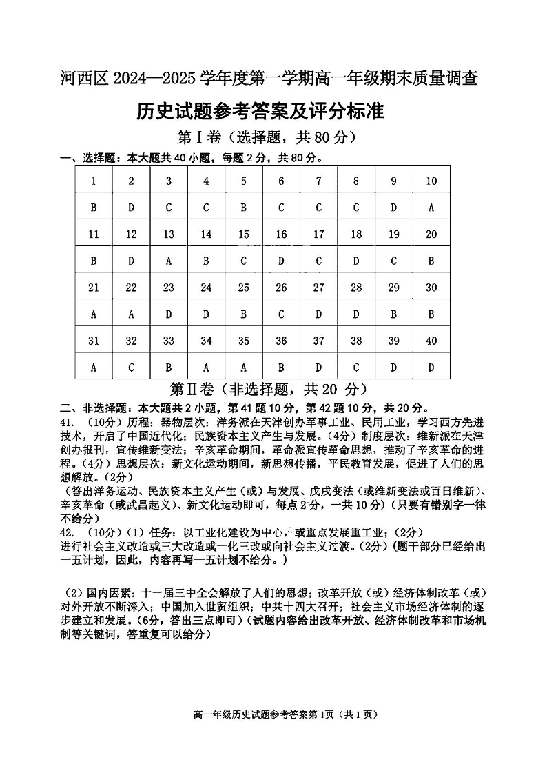 天津市河西区2024-2025学年上学期1月高一期末考试历史答案