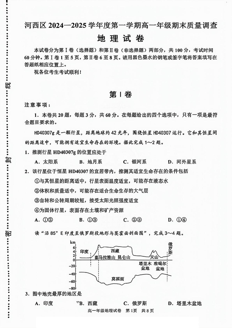 天津市河西区2024-2025学年高一上学期1月期末考试地理