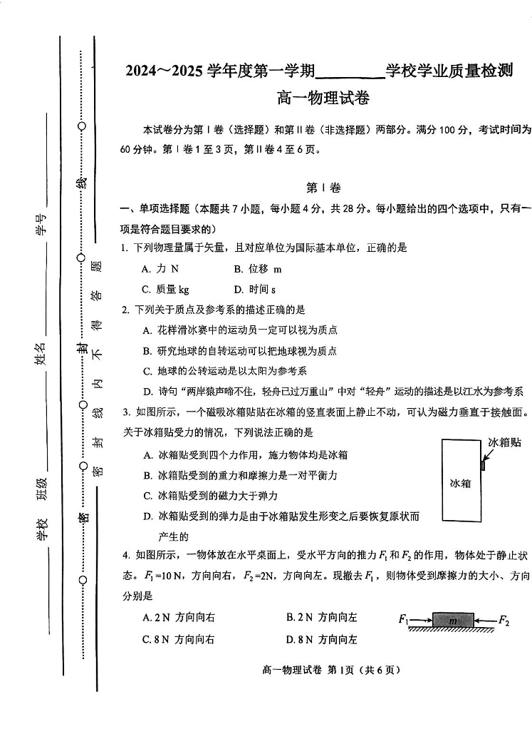 天津市西青区2024-2025学年高一上学期期末考试物理
