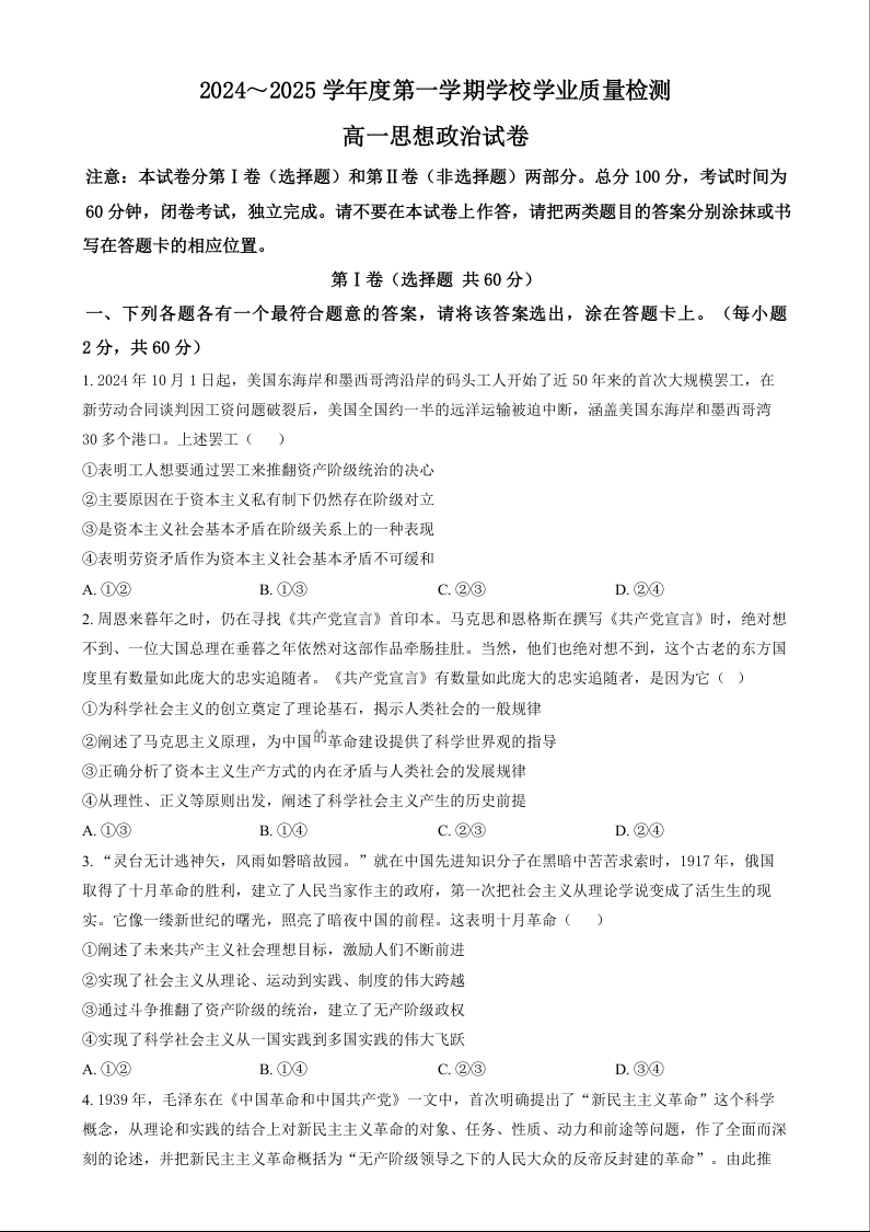 天津市西青区2024-2025学年高一上学期期末考试政治试题政治(原卷版)