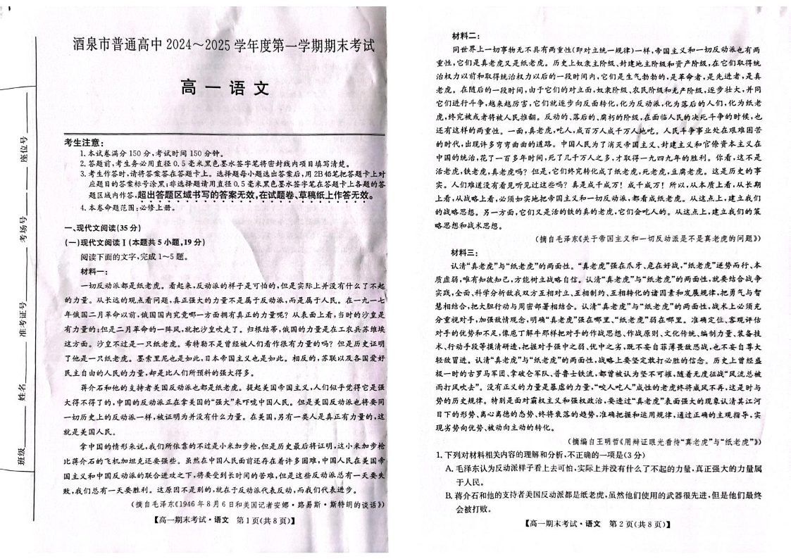 甘肃省酒泉市2024-2025学年上学期1月高一期末考试语文