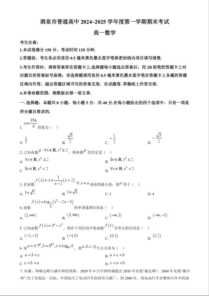 甘肃省酒泉市2024-2025学年上学期1月高一期末考试数学(原卷版)
