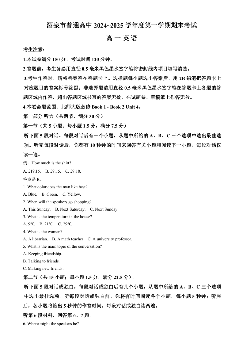 甘肃省酒泉市2024-2025学年上学期1月高一期末考试英语(原卷版)