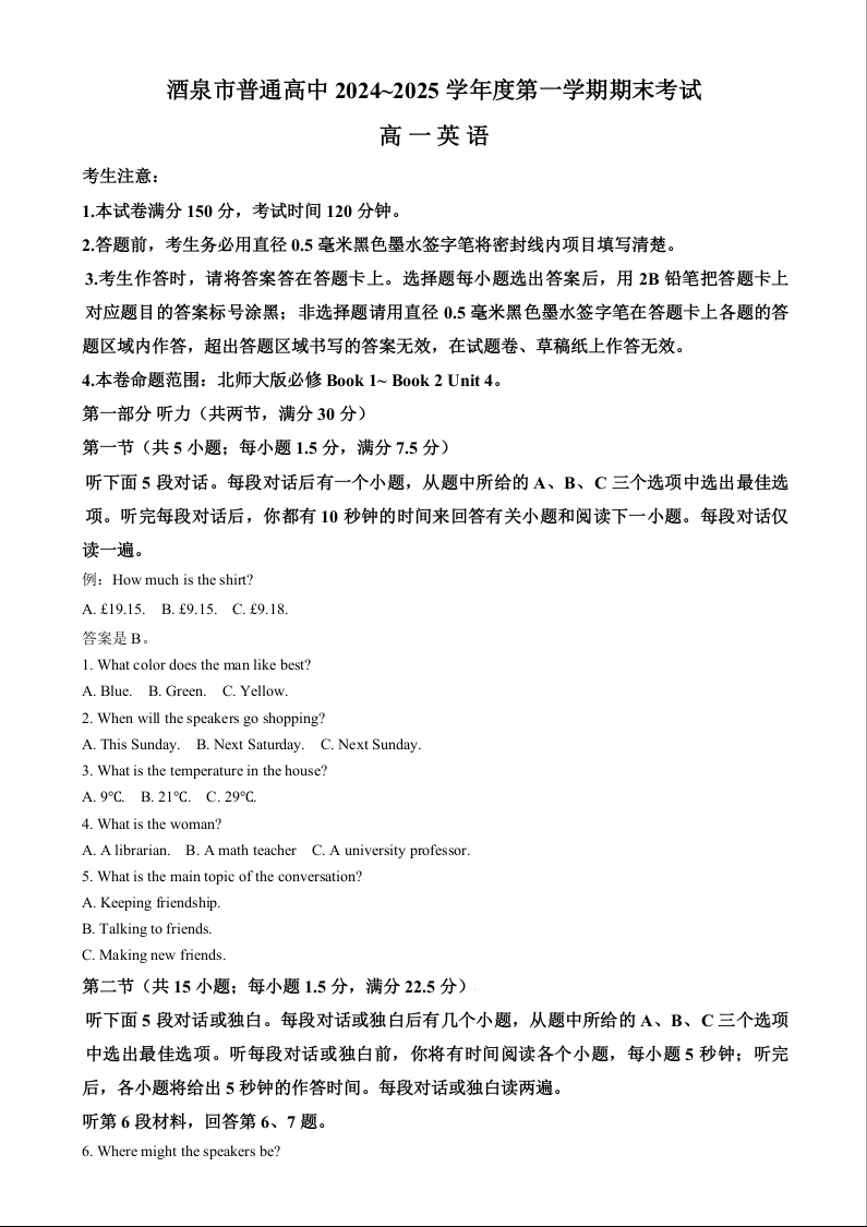 甘肃省酒泉市2024-2025学年上学期1月高一期末考试英语(解析版)