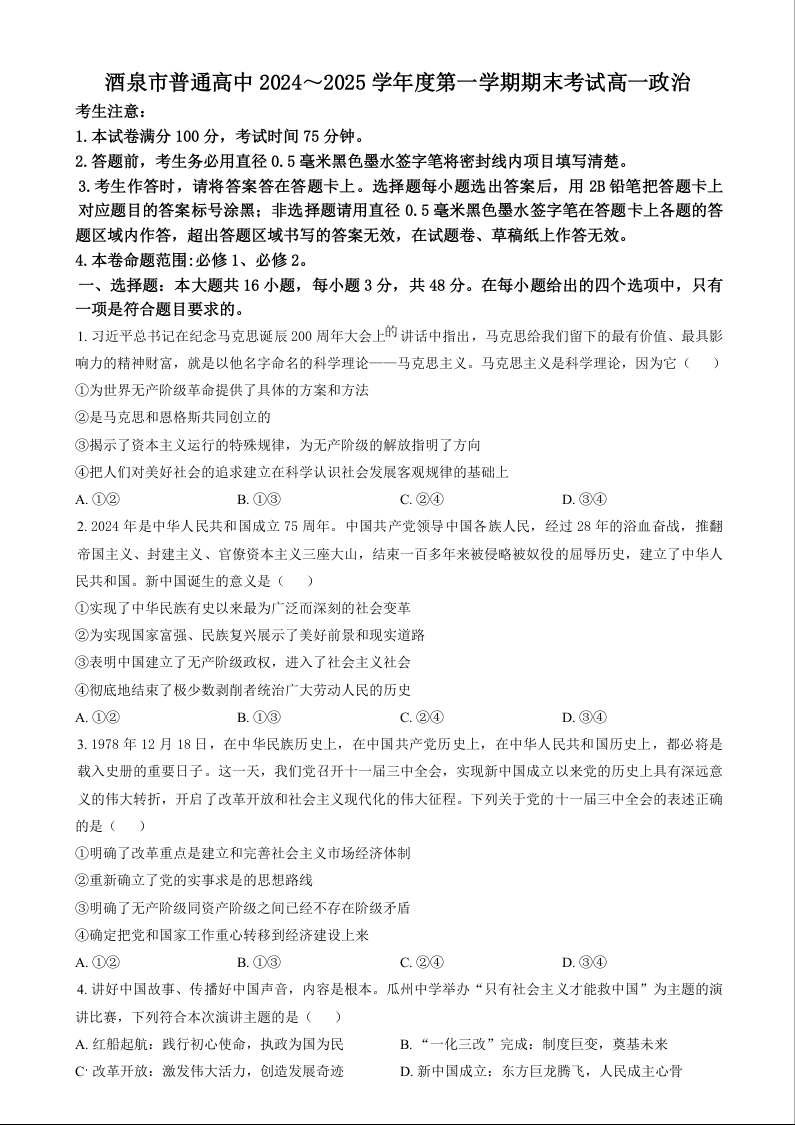 甘肃省酒泉市2024-2025学年上学期1月高一期末考试政治(原卷版)