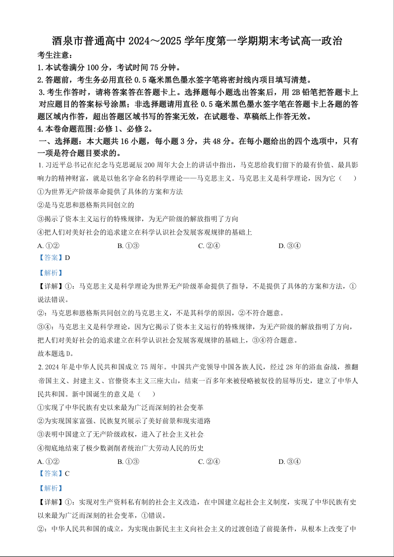 甘肃省酒泉市2024-2025学年上学期1月高一期末考试政治(解析版)