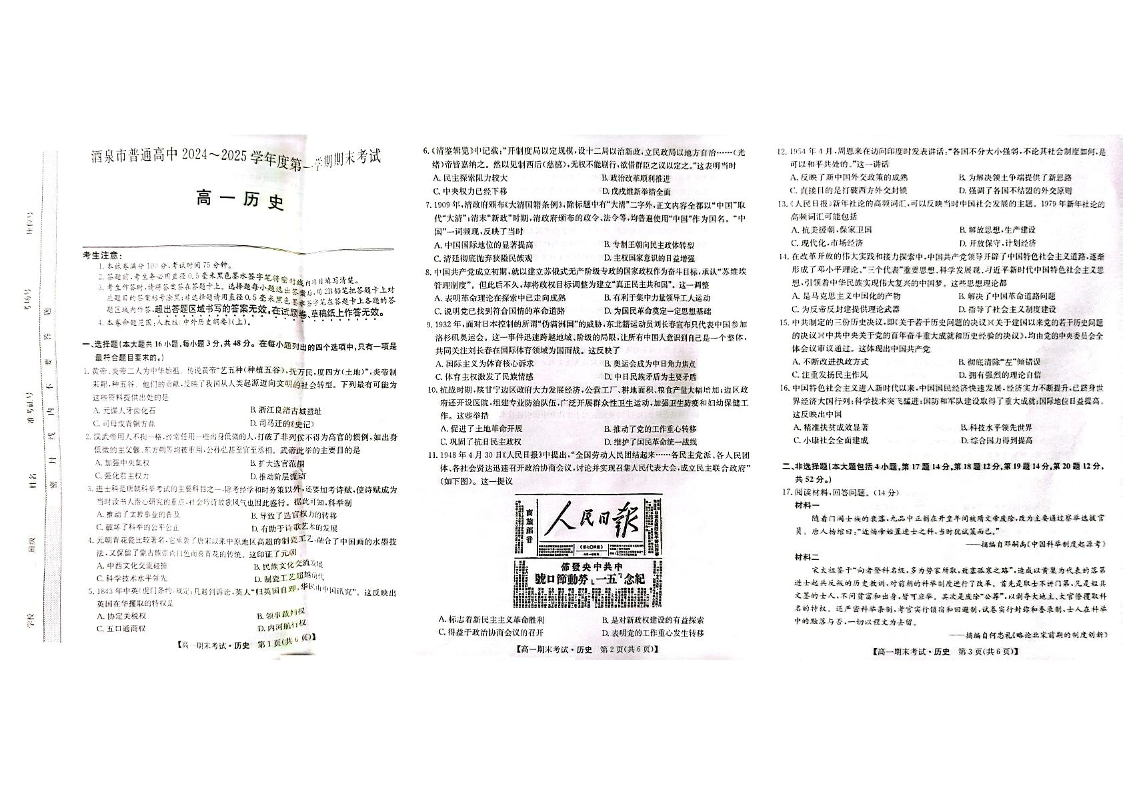 甘肃省酒泉市2024-2025学年上学期1月高一期末考试历史