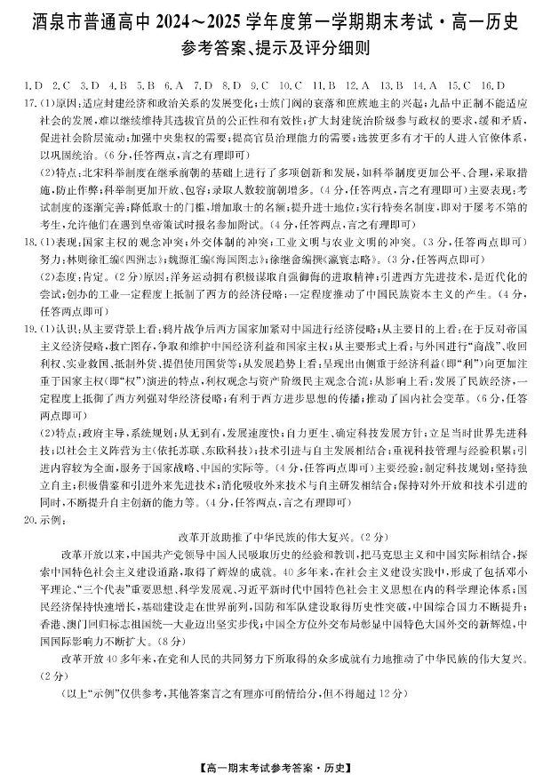 甘肃省酒泉市2024-2025学年上学期1月高一期末考试历史答案