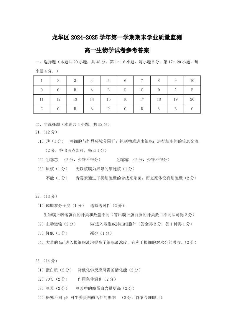 广东省深圳市龙华区2024-2025学年上学期1月高一期末学业质量监测生物答案