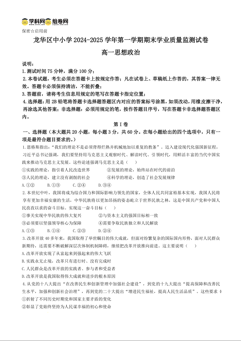 广东省深圳市龙华区2024-2025学年上学期1月高一期末学业质量监测政治