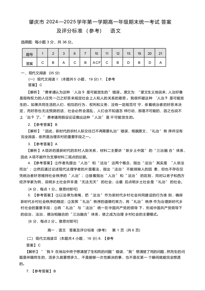 广东省肇庆市2024-2025学年上学期1月高一期末统一考试语文答案