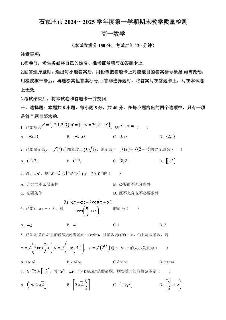 河北省石家庄市2024-2025学年上学期1月高一期末考试数学+答案