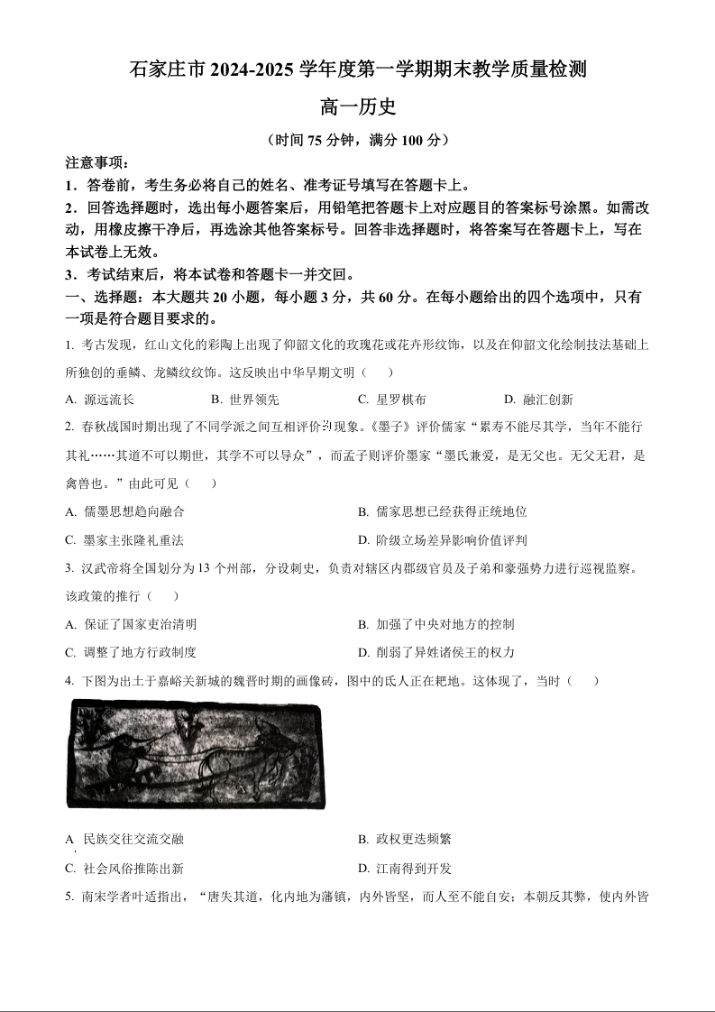 河北省石家庄市2024-2025学年高一上学期期末考试历史(原卷版)