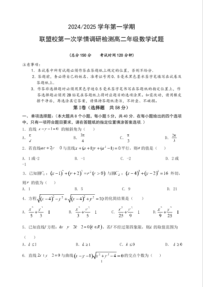 江苏省盐城市五校联考2024-2025学年度第一学期联盟校第一次学情调研检测数学