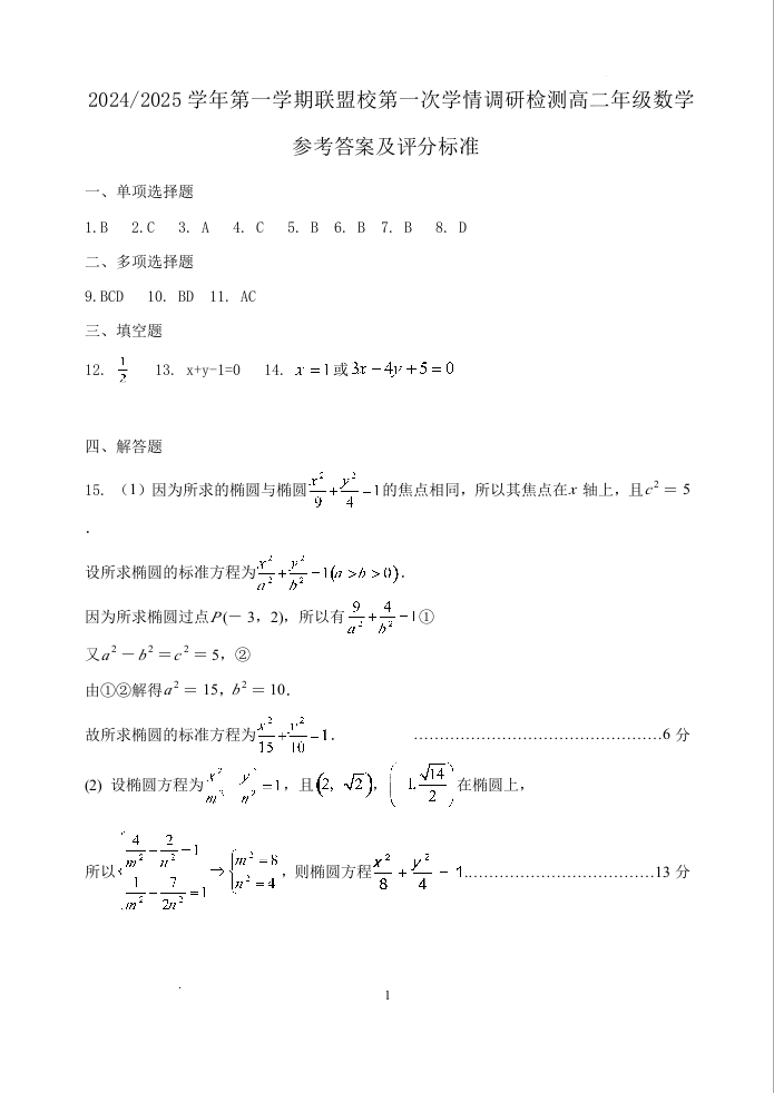 江苏省盐城市五校联考2024-2025学年度第一学期联盟校第一次学情调研检测数学答案