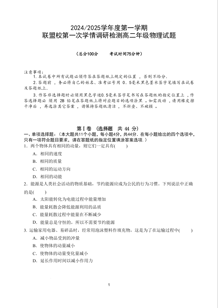 江苏省盐城市五校联考2024-2025学年度第一学期联盟校第一次学情调研检测物理