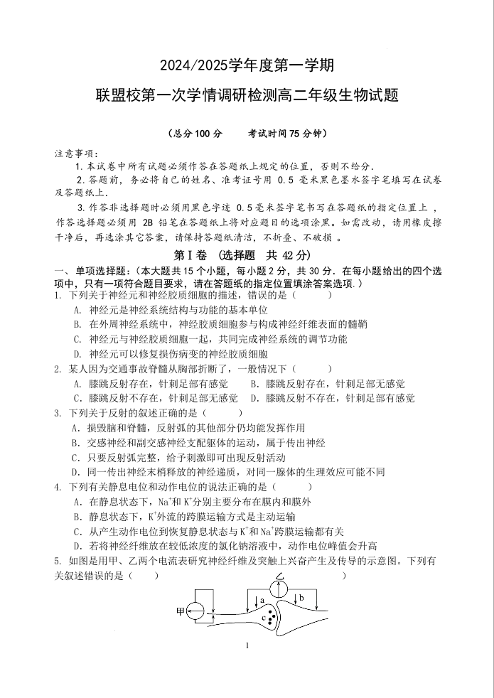 江苏省盐城市五校联考2024-2025学年度第一学期联盟校第一次学情调研检测生物